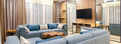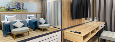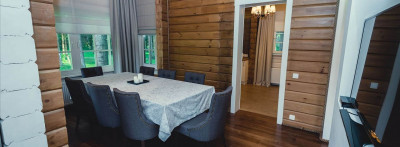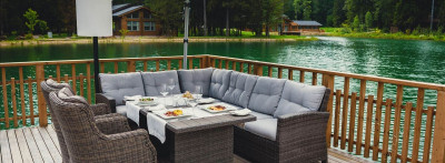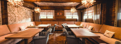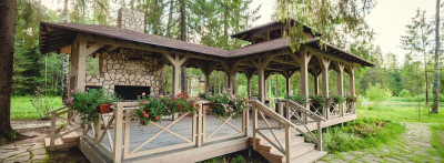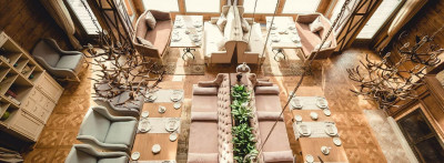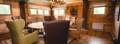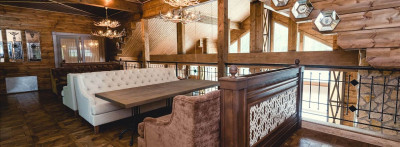 ресторан «Эмеральд» и банкетные залы вместимостью до 100 человек. Все площадки оформлены в экостиле, в естественных тонах, в интерьере преобладает дерево;