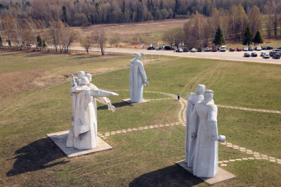 - На месте боя возвышается шесть десятиметровых фигур с автоматами и гранатами в руках. Здесь можно увидеть восстановленные окопы и блиндажи.