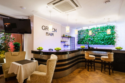 Ресторан Grand Wellness на первом этаже отеля оформлен в классическом колониальном стиле. Он располагает двумя залами. Здесь подают блюда европейской кухни. На третьем этаже находится лаундж-бар с европейской кухней и кальянами. Летом работает открытая веранда.
