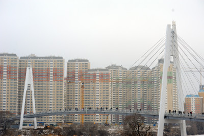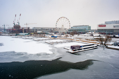 С моста красиво просматриваются строящиеся здания со стеклянными панелями, кольцо обозрения, яхт-клуб и Никольская церковь.