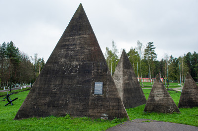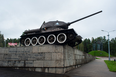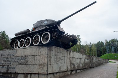 На территории комплекса на высокой платформе установлены бетонные пирамиды-надолбы и танк Т-34-85.