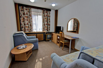 Помимо семейных номеров в пансионате имеются одноместные комнаты, а также номера категорий эконом, стандарт и люкс.