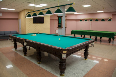 В бильярдном зале спортивного комплекса установлены два 12-футовых стола для игры в русскую пирамиду. Гольф-симулятор полностью имитирует игру и погружает в атмосферу аристократического развлечения.
