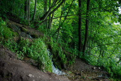 Поток воды течет по крутому берегу реки Нары, минуя крупные глыбы камней, поросшие ярко-зеленым мхом и изумрудной травой.